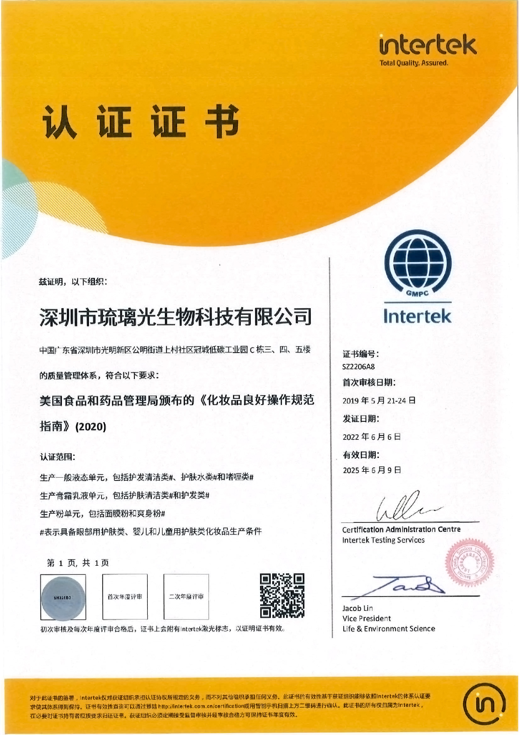 2016年積極響應國家“二證合一”新政策,率先通過新標準取得《化妝品生產許可證》。